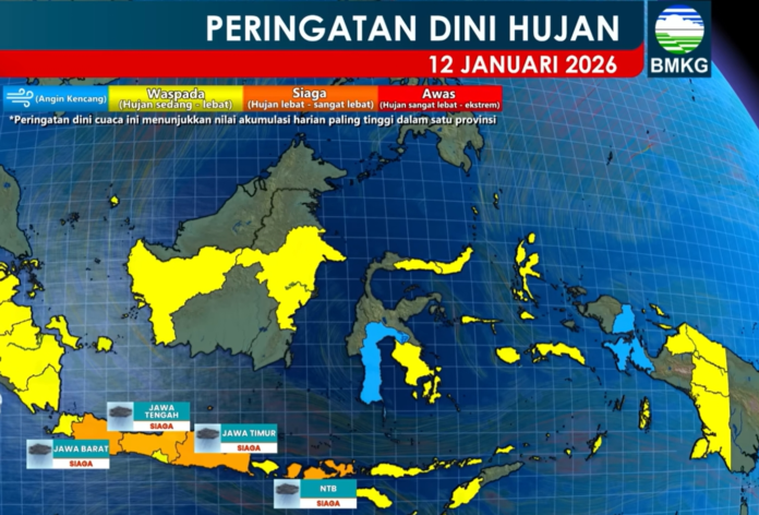 Wartadaerah.com, Jakarta – Badan Meteorologi, Klimatologi, dan Geofisika (BMKG) mengingatkan masyarakat untuk meningkatkan kewaspadaan terhadap potensi hujan lebat hingga sangat lebat yang diprakirakan terjadi di sejumlah wilayah Indonesia pada Senin, 12 Januari 2026, khususnya di Jawa Barat, Jawa Tengah, Jawa Timur, dan Nusa Tenggara Barat (NTB).