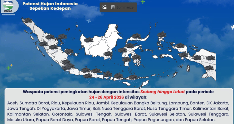 Untuk periode 24–26 April 2026, cuaca Indonesia diperkirakan didominasi hujan ringan hingga lebat. Peningkatan hujan sedang hingga lebat berpotensi terjadi di Aceh, Sumatra Barat, Riau, Kepulauan Riau, Jambi, Bangka Belitung, Lampung, Banten, DKI Jakarta, Jawa, Bali, Nusa Tenggara, Kalimantan, Sulawesi, Maluku, hingga Papua.